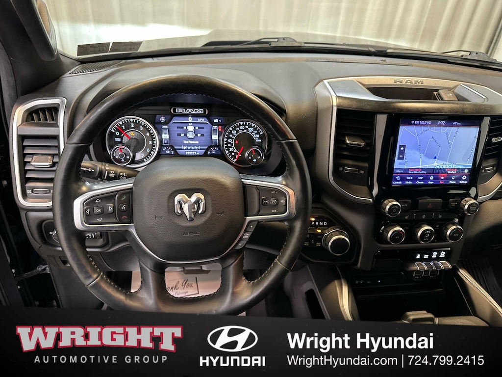Radio: Uconnect 4 w/8.4 Display, Rear Window Defroster, Integrated Center Stack Radio, ParkSense Front/Rear Park Assist w/Stop, Rear View Auto Dim Mirror, Power Adjustable Pedals, Rear Power Sliding Window, Rear Dome w/On/Off Switch Lamp, Glove Box Lamp, Power 4-Way Driver Lumbar Adjust, 115V Auxiliary Rear Power Outlet, Power 8-Way Driver Seat, 2 USB Full Function/Charge Only Media Hub, Heated Front Seats, Heated Steering Wheel, 8.4 Touchscreen Display, Foam Bottle Insert (Door Trim Panel), Class IV Receiver Hitch, Dampened Tailgate, Security Alarm, Power Heated Fold Away Mirrors, Big Horn IP Badge, Remote Start System, SiriusXM Satellite Radio, 400W Inverter, Air Conditioning ATC w/Dual Zone Control, 115V Auxiliary Power Outlet, Cluster 7.0 TFT Color Display, Universal Garage Door, Tires: 275/55R20 OWL All Season, Exterior Mirrors w/Supplemental Signals, Black Headlamp Bezels, Power Heated Fold-Away Mirrors, Body Color Door Handles, Exterior Mirrors Courtesy Lamps, Auto Dim Exterior Driver Mirror, Black Exterior Truck Badging, Exterior Mirrors w/Memory, Grille B/Color Outline 1 Texture 2, Black Interior Accents, Dual Exhaust w/Black Tips, Power-Folding Mirrors, Body Color Front Bumper, Wheels: 20 x 9 Cast Aluminum Black, Body Color Rear Bumper w/Step Pads, Active Noise Control System, 180 Amp Alternator, Heavy Duty Engine Cooling, GVWR: 7,100 lbs, Dual Rear Exhaust w/Bright Tips, Hemi Badge, Front LED Fog Lamps, LED Reflector Headlamps, LED Taillamps, Google Android Auto®, SiriusXM Traffic Plus, SiriusXM Satellite Radio, Disassociated Touchscreen Display, HD Radio, For Details, Visit DriveUconnect.com, Integrated Center Stack Radio, For More Info, Call 800-643-2112, 1-Yr SiriusXM Guardian Trial, Air Conditioning ATC w/Dual Zone Control, GPS Navigation, SiriusXM Travel Link, No Satellite Coverage w/HI/AK/PR/VI/GU, 8.4 Touchscreen Display, Apple CarPlay®, Engine: 5.7L V8 HEMI MDS VVT, Transmission: 8-Speed Automatic (8HP75), Steering Wheel Mounted Audio Controls, TRANSMISSION: 8-SPEED AUTOMATIC (8HP75), Power 8-Way Driver Seat, Center Console Parts Module, Bucket Seats, Manual Adjust 4-Way Front Passenger Seat, Full Length Floor Console, Power 4-Way Driver Lumbar Adjust. Keyless Entry, Privacy Glass, Child Safety Locks, Electronic Stability Control, Brake Assist. Non-Smoker vehicle